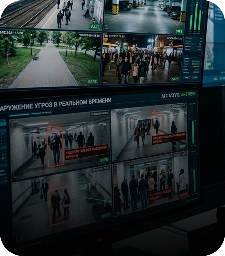 AI анализирует видеопоток и мгновенно выявляет угрозы: драки, подозрительное поведение и другие инциденты.